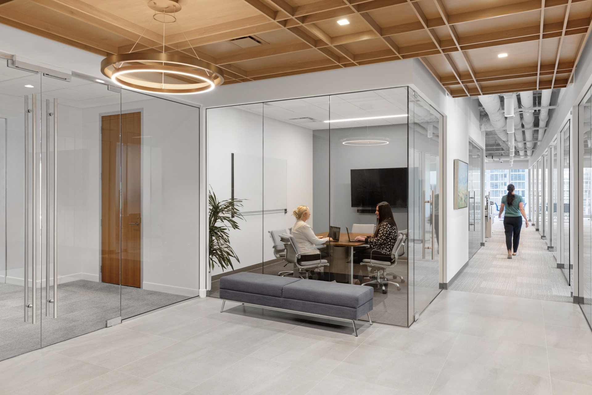 EDA's sophisticated design balances quality and functionality to meet all programmatic requirements while reflecting the client’s professional identity. Glass-fronted offices and meeting rooms promote openness and connectivity, complemented by modern finishes, warm wood ceilings and carefully integrated lighting. The refined palette and streamlined details reinforces MGIS’s reputation with an elegant, efficient, high-performance workplace.